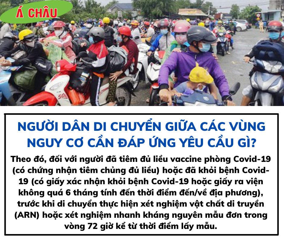 Theo đó, đối với người đã tiêm đủ liều vaccine phòng Covid-19 (có chứng nhận tiêm chủng đủ liều) hoặc đã khỏi bệnh Covid-19 (có giấy xác nhận khỏi bệnh Covid-19 hoặc giấy ra viện không quá 6 tháng tính đến thời điểm đến/về địa phương), trước khi di chuyển thực hiện xét nghiệm vật chất di truyền (ARN) hoặc xét nghiệm nhanh kháng nguyên mẫu đơn trong vòng 72 giờ kể từ thời điểm lấy mẫu.