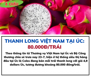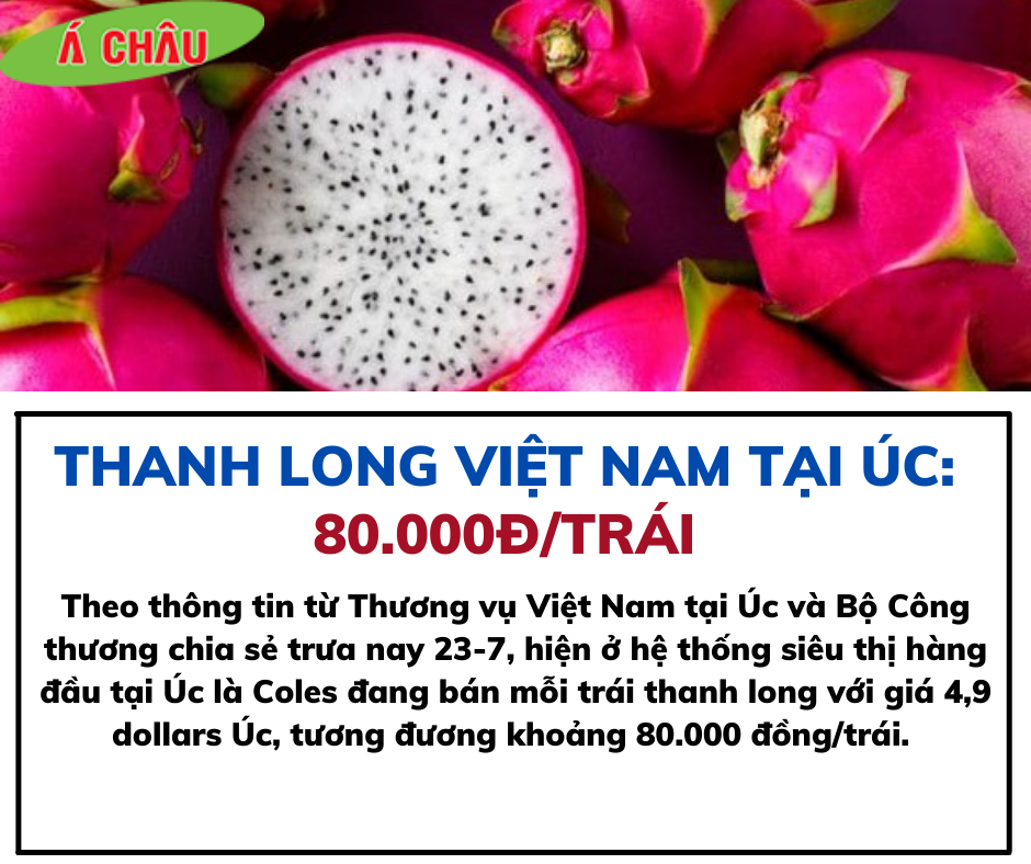 Theo thông tin từ Thương vụ Việt Nam tại Úc và Bộ Công thương chia sẻ trưa nay 23-7, hiện ở hệ thống siêu thị hàng đầu tại Úc là Coles đang bán mỗi trái thanh long với giá 4,9 dollars Úc, tương đương khoảng 80.000 đồng/trái.